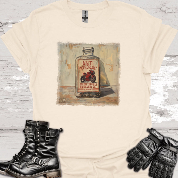 Rev up your style with this vintage-inspired 'Antidepressant' motorcycle T-shirt. Featuring a retro design with a Sports Bike in a bottle labeled 'For Best Results, Ride Every Day,' this tee is perfect for passionate bikers.