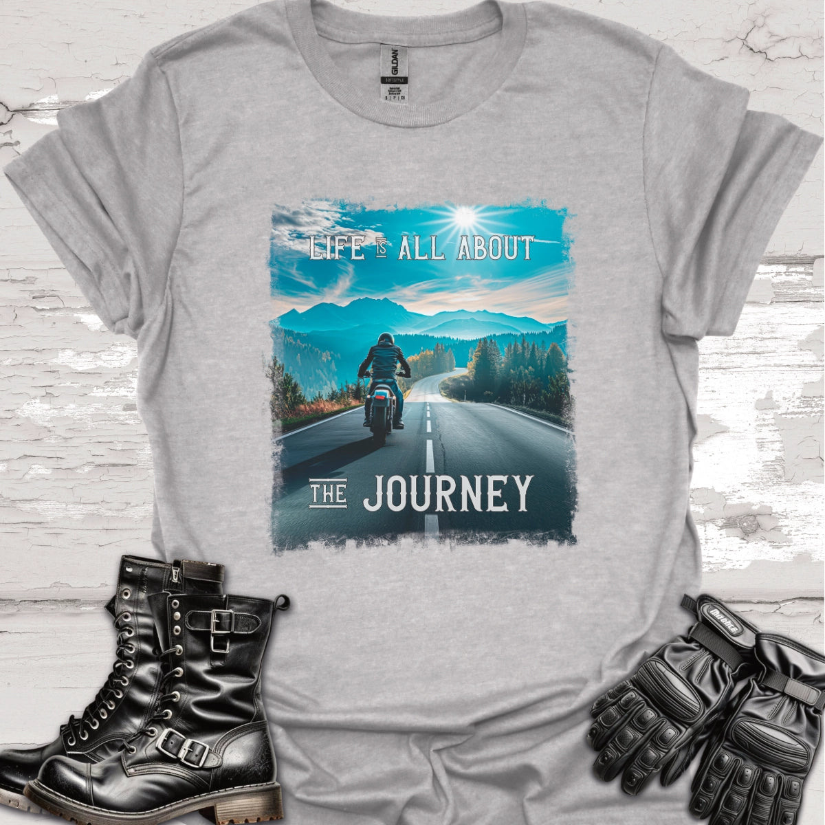 Hit the open road in style with our "Life Is All About the Journey" biker T-shirt. Featuring a stunning photo of a lone biker cruising down a scenic highway, this tee captures the essence of freedom and adventure.