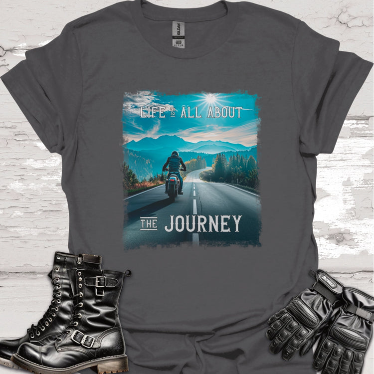 Hit the open road in style with our "Life Is All About the Journey" biker T-shirt. Featuring a stunning photo of a lone biker cruising down a scenic highway, this tee captures the essence of freedom and adventure.