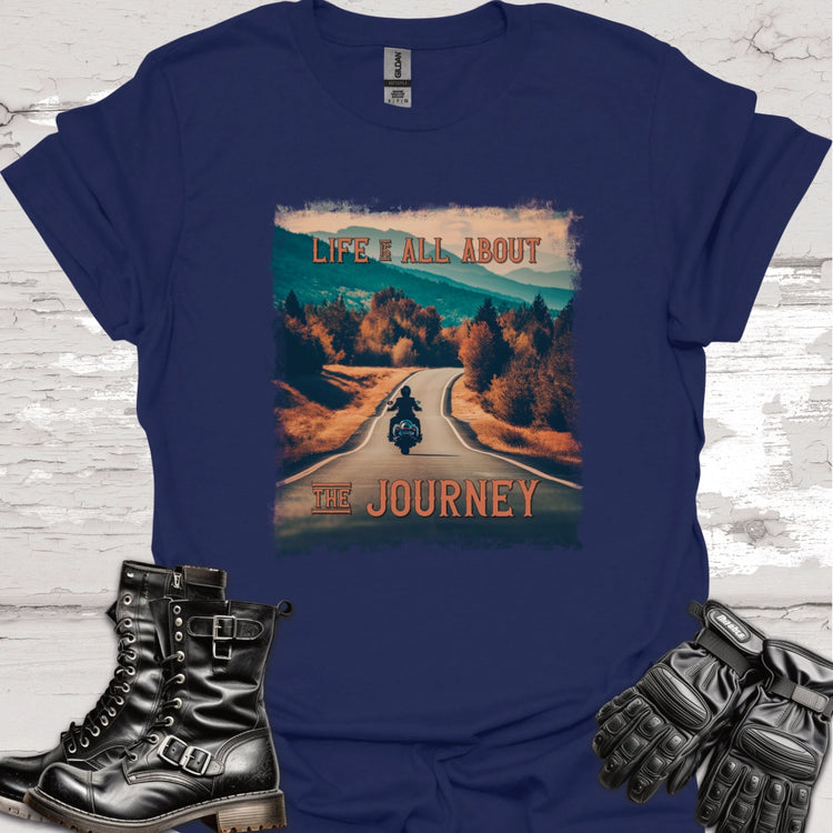 Hit the open road in style with our "Life Is All About the Journey" biker T-shirt. Featuring a stunning photo of a lone biker cruising down a scenic highway, this tee captures the essence of freedom and adventure.